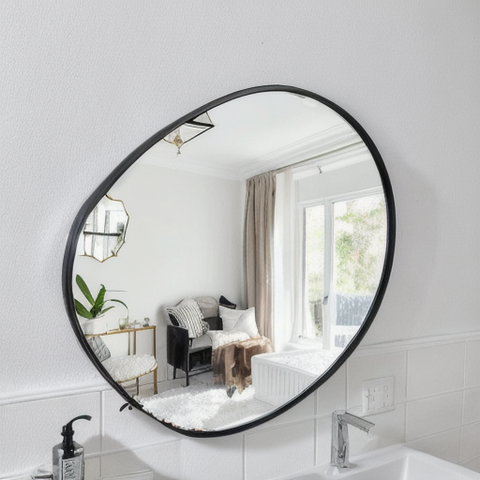 กรอบโลหะขนาดใหญ่แบบไม่สม่ำเสมอสีดำขนาดใหญ่ของตกแต่งห้องน้ำกระจกติดผนังแบบแขวน